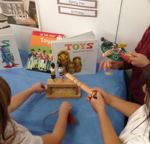 The children were able to discuss in detail similarities and differences in the toys and identify what materials the various items were made from linking in with Science. The children enjoyed playing with many of the toys which included marbles; dolls; finger puppets; yoyos; cup and ball; pop gun and spinning top we even played hopscotch outside in the playground.