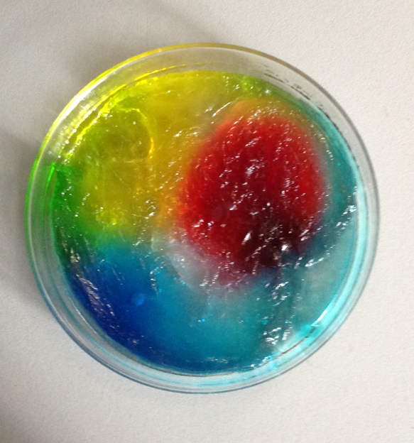 Diffusion experiment – we observed over time that the food colouring was absorbed into the gelatine.