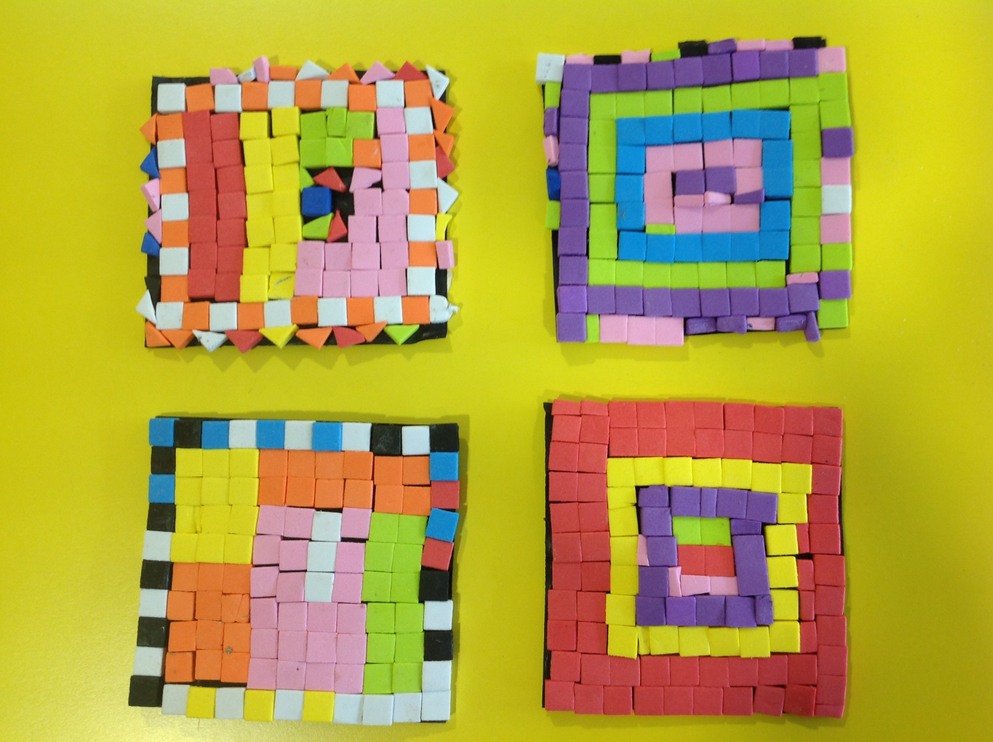 We have looked at warm and cool colours along with complimentary mixtures. We also learned about mosaic art from ancient Rome. It was interesting to see how they made designs with small pieces of coloured tiles.